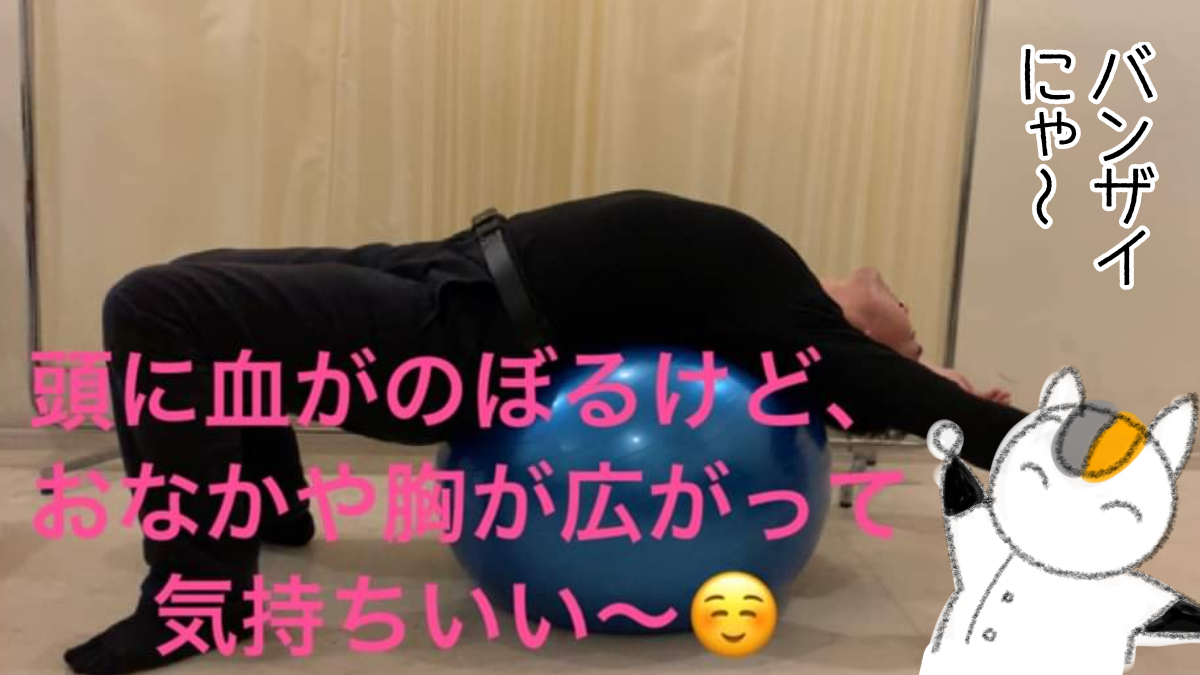 画像のように仰向けで、バランスボールの上に背中と両肩を当てて、両腕を頭上に垂らします。